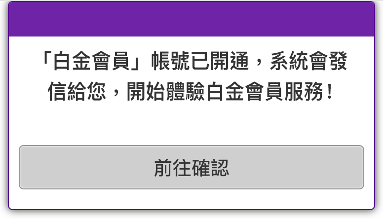 恭喜您成功兑换“白金会员”,确认完会员资料,即可开始体验白金服务!